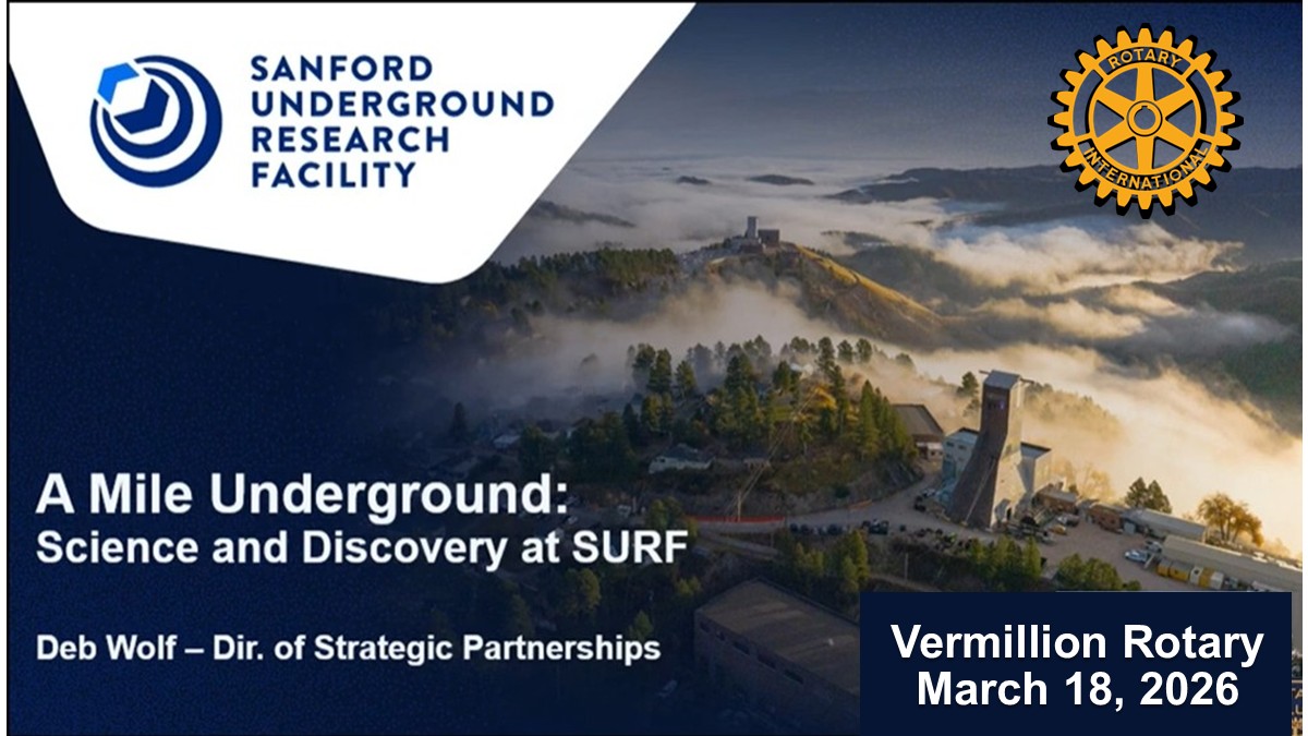 Deb Wolf, Director of Strategic Partnerships, provides a detailed, informative presentation about America's underground research facility- the Sanford Underground Research Facility (SURF) in the site of the former Homestake mine. She presents fascinating discussion of the operations of facility, examples of research being conducted, the economic impact of the facility and so much more. The facility is so important because it's deep underground location blocks cosmic radiation allowing scientists to study rare subatomic events that would not be possible to study on the Earth's surface. Research on Dark Matter and Neutrinos is being conducted, along with projects in geology, biology and engineering. Click on the image below to view this wonderful presentation on the Vermillion Rotary's YouTube channel.